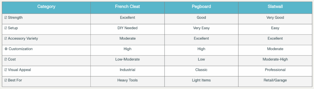 - Accessory Options: Extensive range of commercial accessories—bins, baskets, tool holders—often more diverse than pegboard or French cleat stores provide.