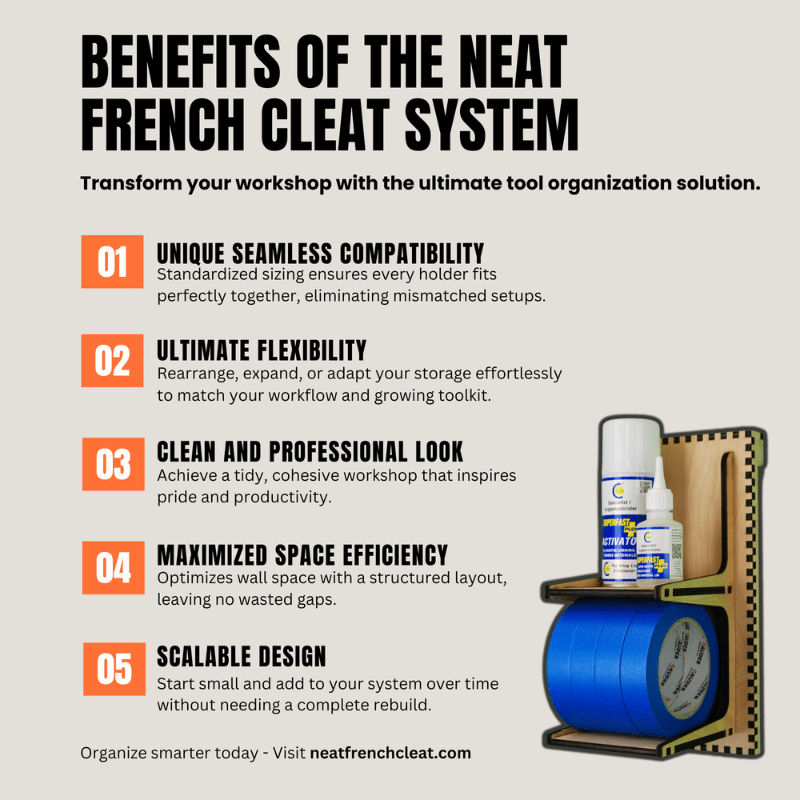 With the Neat French Cleat Master System, you get a modular system of precision-cut pieces. Snap together endless combinations, shape your dream workspace, and make every tool and consumable feel right at home.